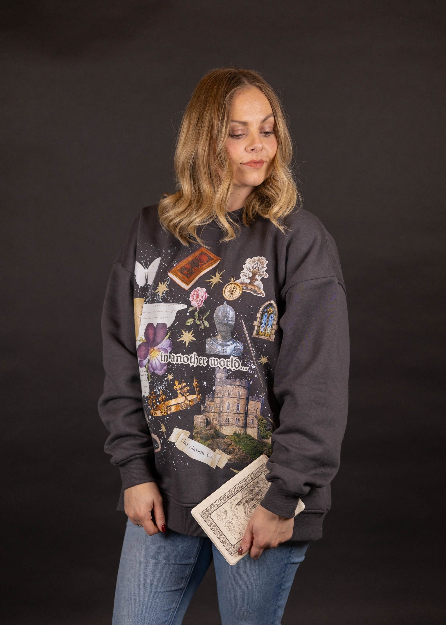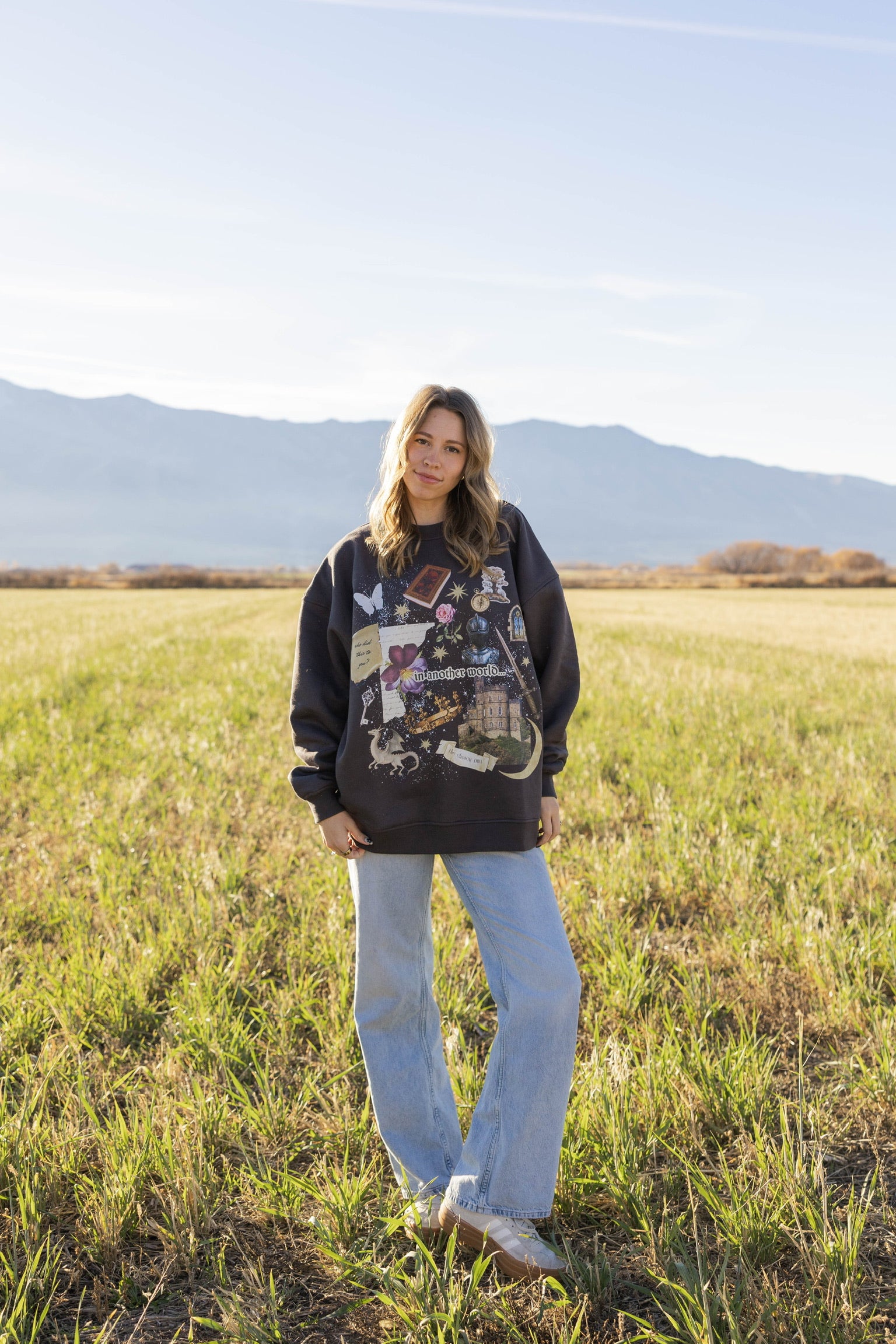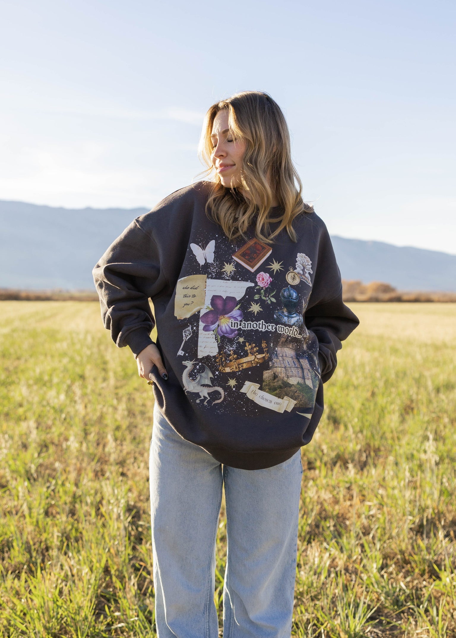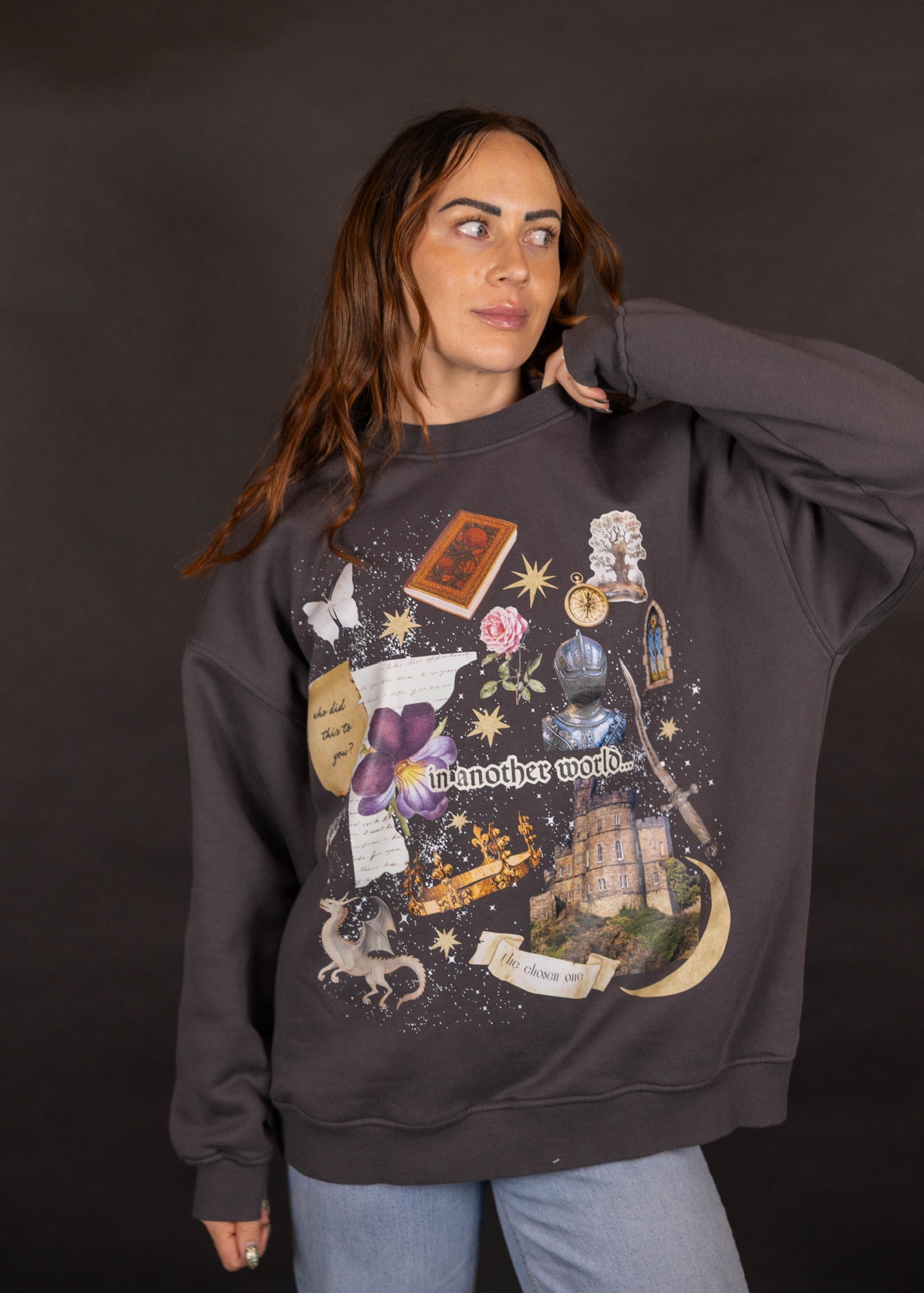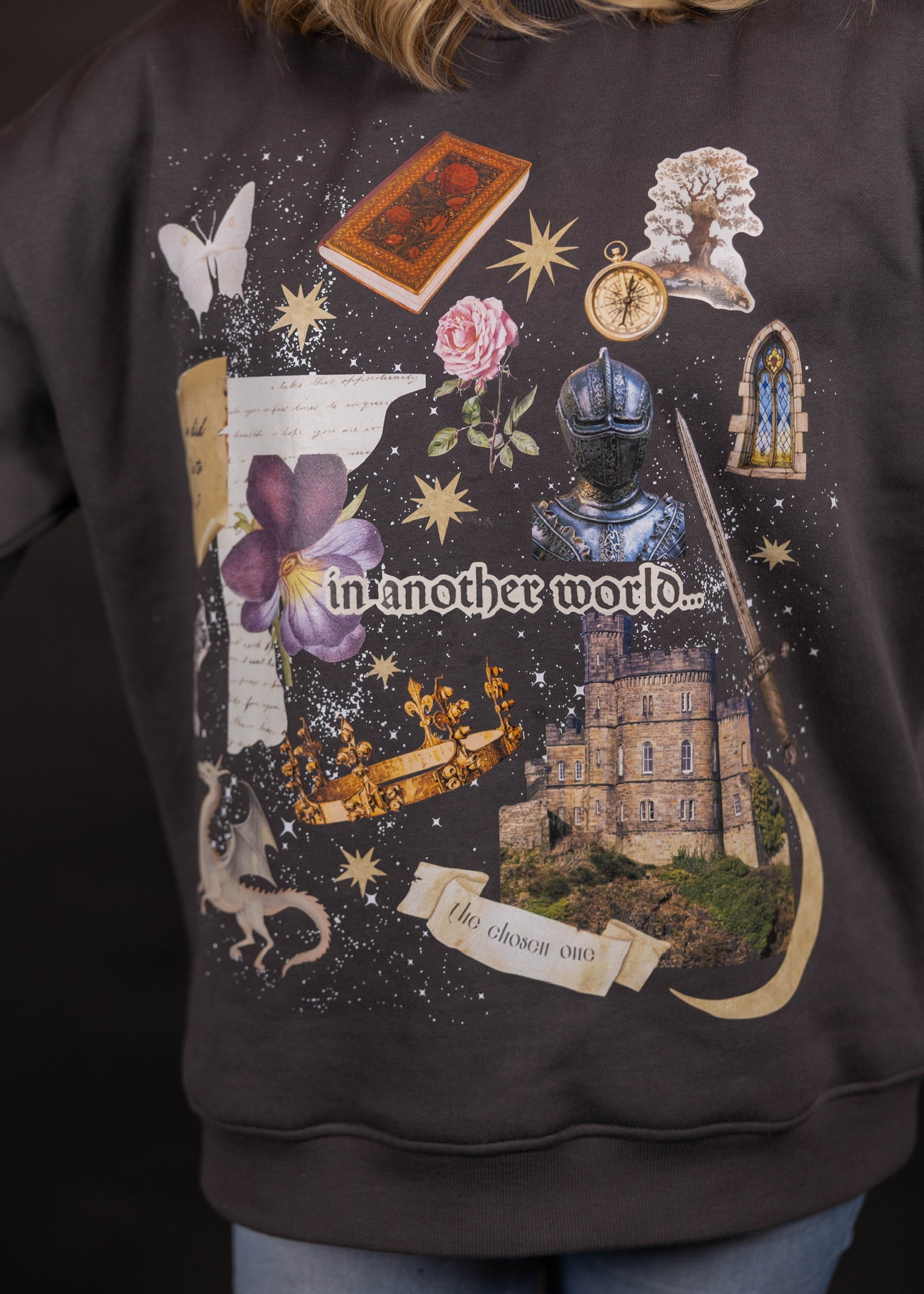 For the ones who live a little more in the fictional worlds than the real one our In Another World crew was made for you. Soft, moody, and effortlessly cool, it’s the perfect piece for late-night reading sessions or cozy castle-core vibes.