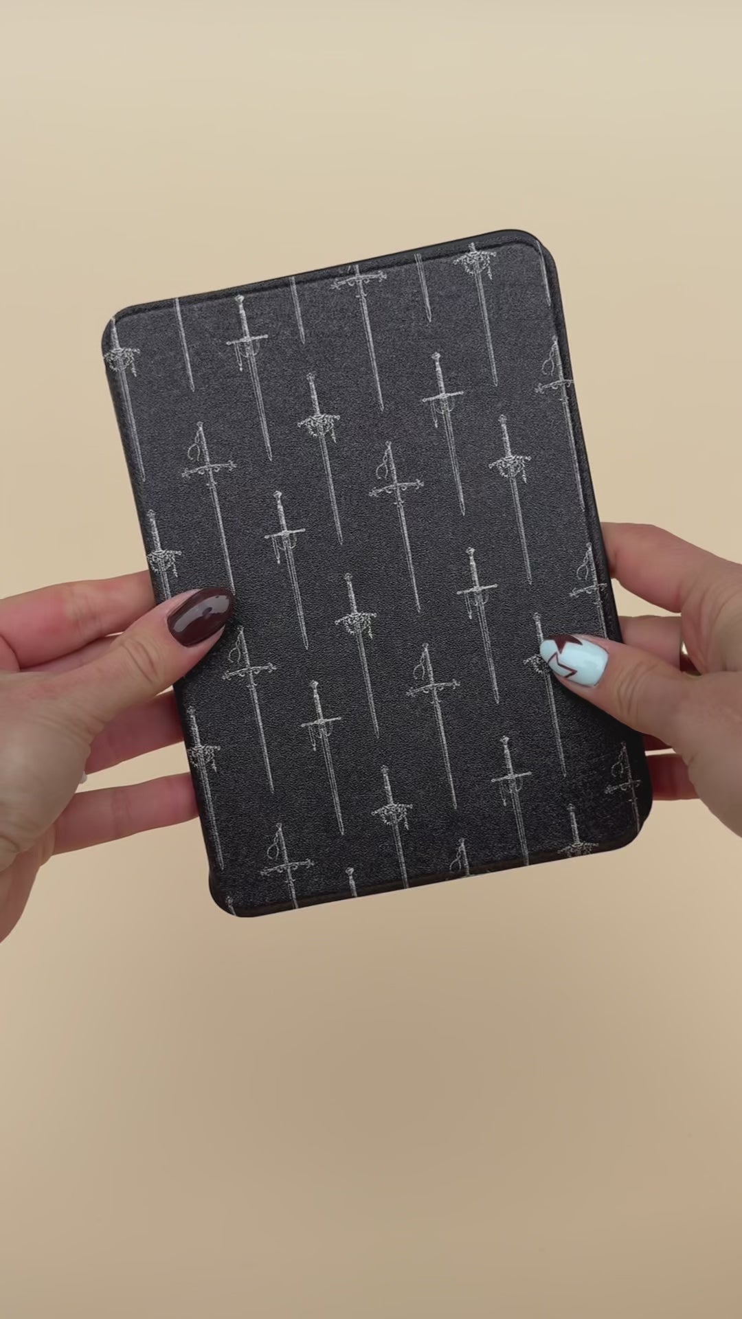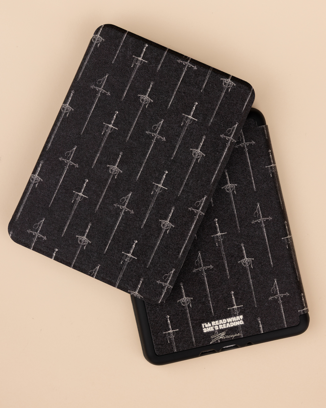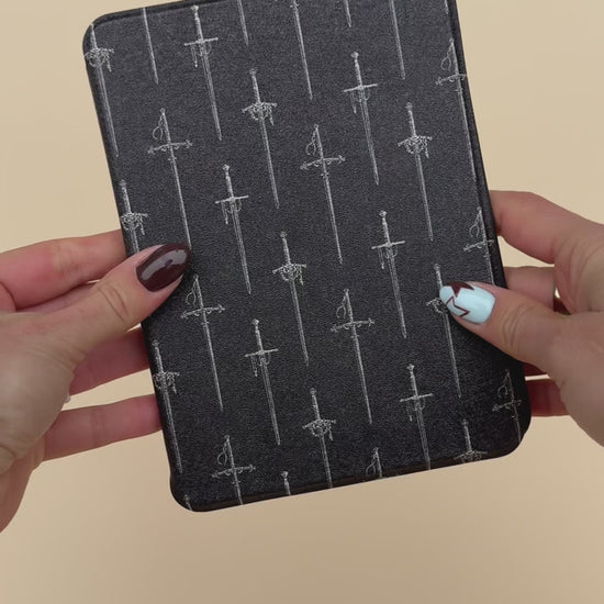Your kindle deserves armor worthy of its stories. This sleek, charcoal case is patterned with elegant blades, because every reader knows that stories are our sharpest weapons.